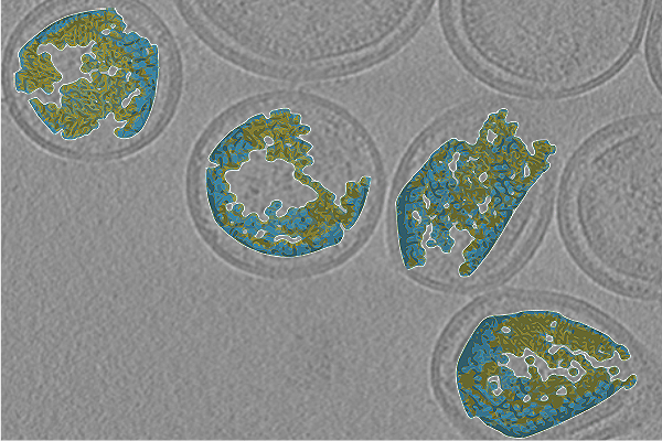 Reconstrução de imagem 3D de partículas do vírus HTLV sobreposta à imagem de tomografia crioeletrônica (crio-ET)